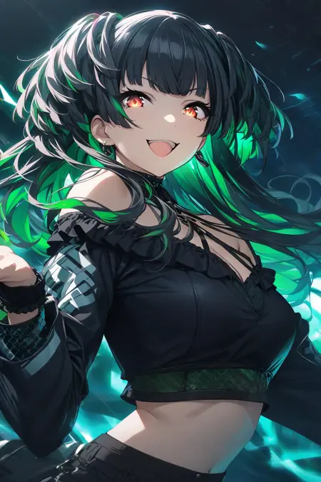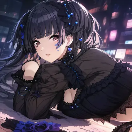 IllustriousXL tag is "mayuzumi_fuyuko, 1girl, gloves, black hair, two side up, brown eyes, small breasts" with alternating "pink eyes" color when the lighting is darker.
