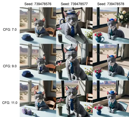 示例中使用的提示:“一只灰色的猫穿着蓝色西装、戴着红色帽子、系着绿色领带,坐在一张白色桌子旁,房间内有大窗户,窗外是一片开满花朵的沙漠景观”。