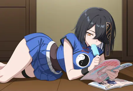 Swimsuit 3: black hair, short hair, yellow eyes, mole under eye, hair covering one eye, hair ornament, large hat, cap visor, one-piece swimsuit, swimsuit under clothes, chinese clothes, blue tube top, blue pleated skirt, belt, ying yang print, thigh strap, wristband,