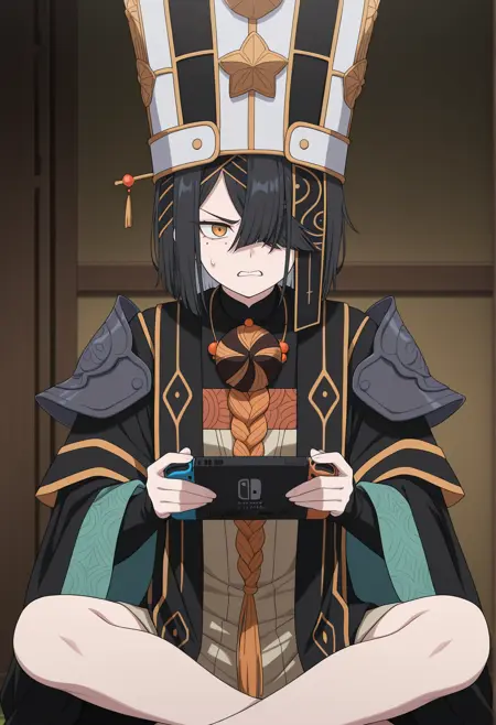 third ascension: black hair, short hair, yellow eyes, mole under eye, hair covering one eye, hair ornament, mitre, chinese hairpin, pauldrons, stole, tunic, long sleeves, medallion