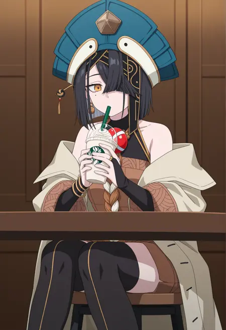 1st ascension: black hair, short hair, yellow eyes, mole under eye, hair covering one eye, hair ornament, blue hat, chinese hairpin, chest jewel, rope, bridal gauntlets, sleeveless, coat, long sleeves, off shoulder, thighhighs