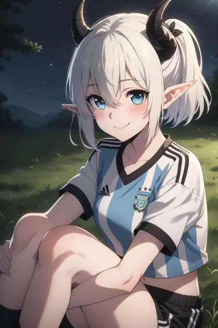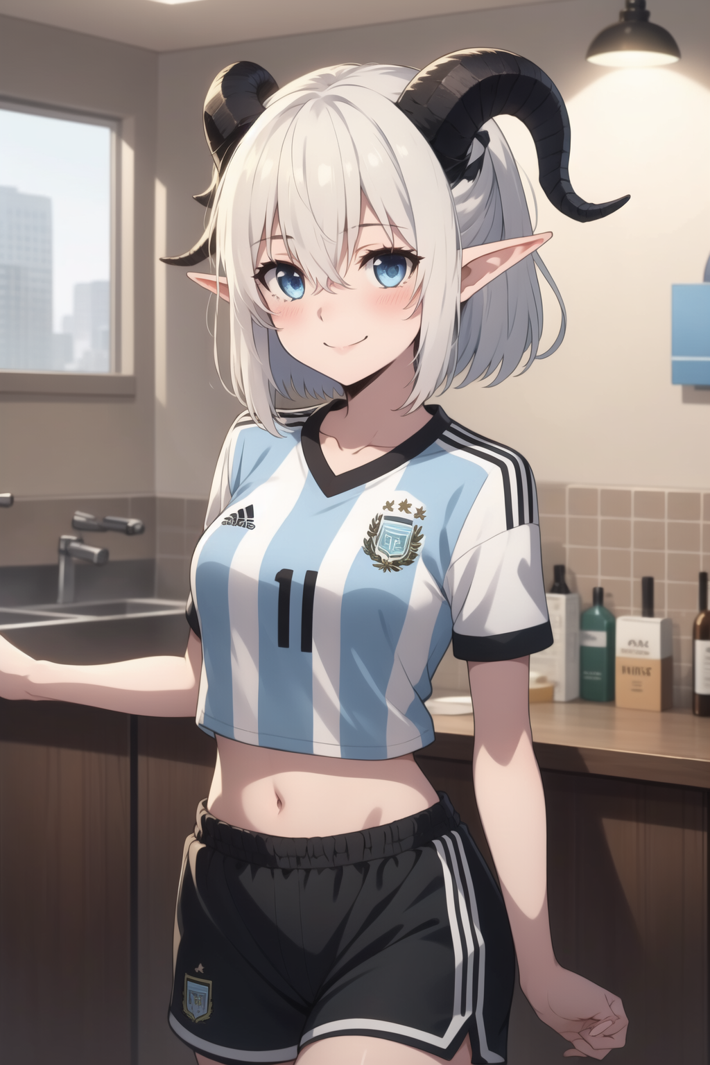 스포츠웨어와 함께: Mialygosa lora:Mialygosa-10:1, 단발, 파란 눈, 셔츠, 배꼽, 눈 사이의 머리카락, 중간 크기의 가슴, 어깨뼈, 언더핀, 번호 10, 하얀 머리카락, 짧은 소매, 허벅지, 뿔, 반바지, 뾰족한 귀, 복부, 짧은 반바지, 검은 반바지, 파란 셔츠, 악마 뿔, 스포츠웨어, 축구 유니폼, 더블 플랫테일