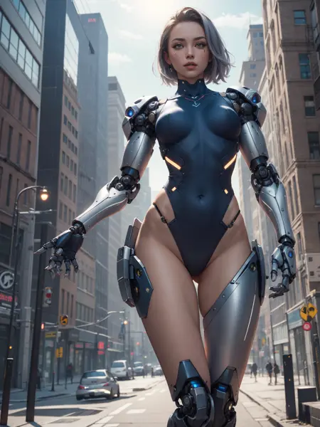 トリガーワード: cyb0rg, 1girl, solo, glowing eyes, android, cyborg, mechanical arms, leotard, robot joints, mountains, castle, space station, city, rooftop, living room, kitchen, mall, tavern, bathroom, living room, desert, waterfall, beach, gym, forest, arcade, office, highway