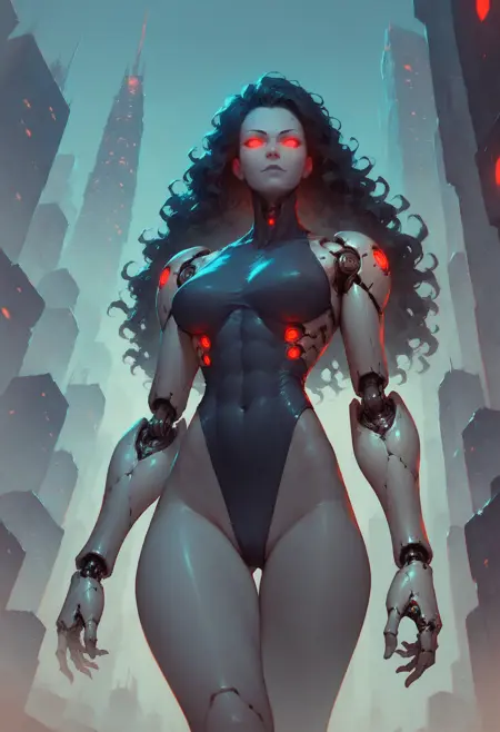 トリガーワード: cyb0rg, 1girl, solo, glowing eyes, android, cyborg, mechanical arms, leotard, robot joints, mountains, castle, space station, city, rooftop, living room, kitchen, mall, tavern, bathroom, living room, desert, waterfall, beach, gym, forest, arcade, office, highway