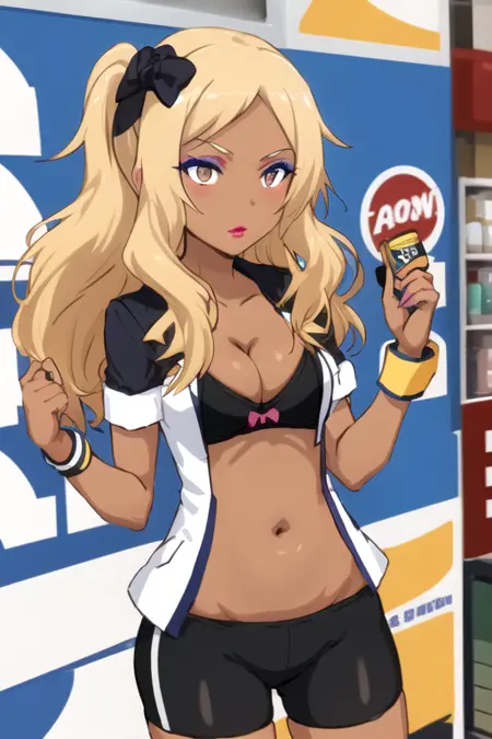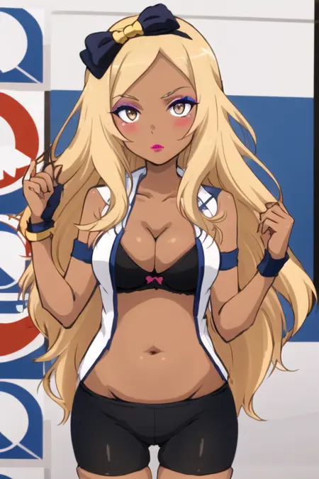 NanaAndersen, 1girl, solo, long hair, blonde hair, navel, cleavage, brown eyes, medium breasts, hair bow, bike shorts, midriff, dark skin, bra, dark-skinned female, makeup, lipstick, wristband,