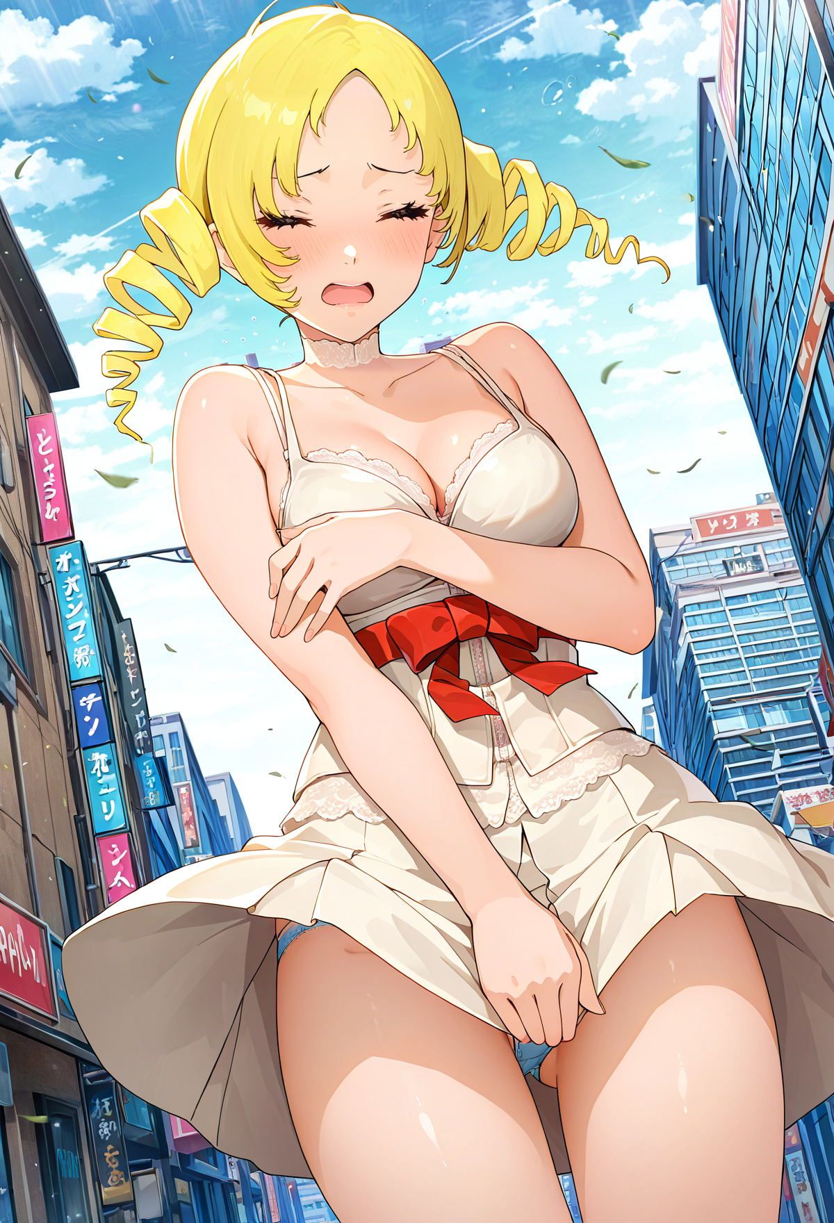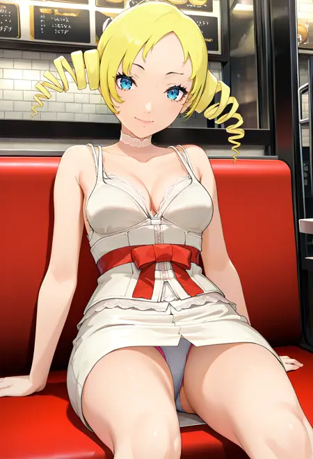 Catherine 的主要服装: catherine,blonde hair,twin drills,makeup,blue eyes,white choker,white dress,red waist bow,white thighhighs