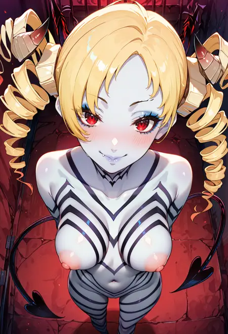 由于 Catherine 已存在于本模型中,我移除了 blonde hair 和 twin drills 标签,并将 succubus catherine 的肤色调整为 striped colored skin。
