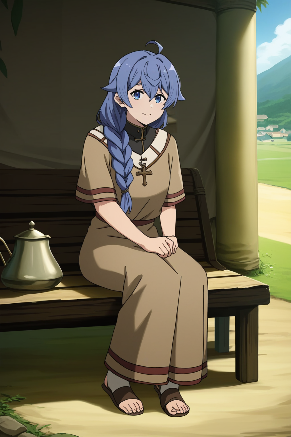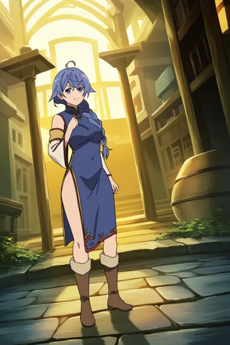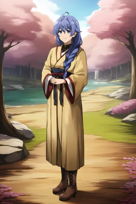 rokari migurudexia, single braid, hair over shoulder, braided ponytail, blue hair, blue eyes, long hair, braid, ahoge, hair between eyes,, bangs,