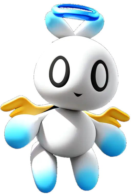 Prompt: Hero Chao, 귀여운, 둥근 물방울 모양의 머리, 검은 공막이 있는 하얀 눈, 손과 발 끝이 하늘색인 하얀 피부, 코 없음, 짧은 꼬리, 작은 천사 날개, 머리 위에 푸른 환각, 둥근 몸통,