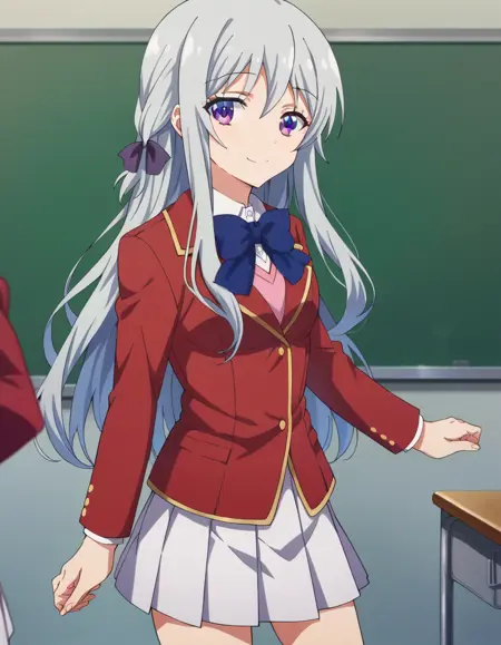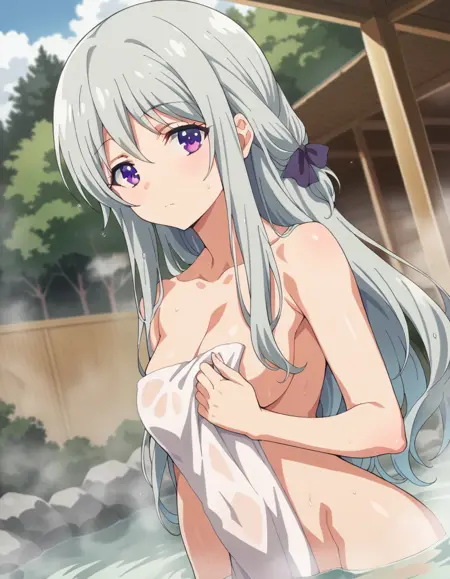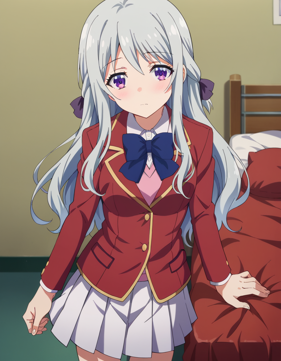 hiyori shiina, long hair, bangs, purple eyes, hair ribbon, grey hair,