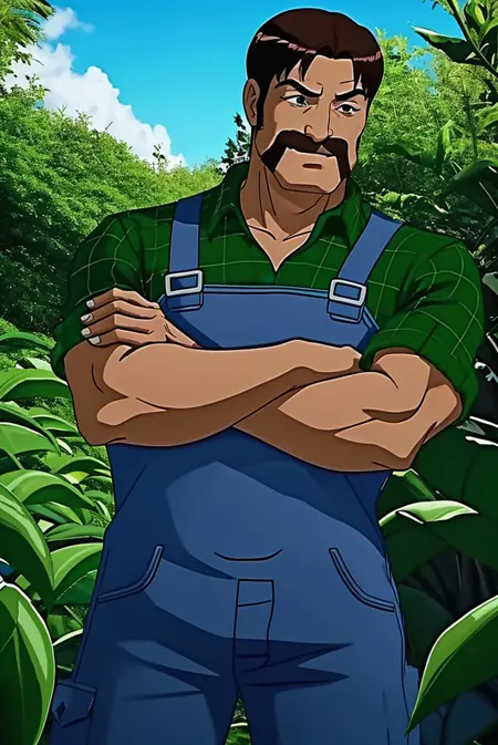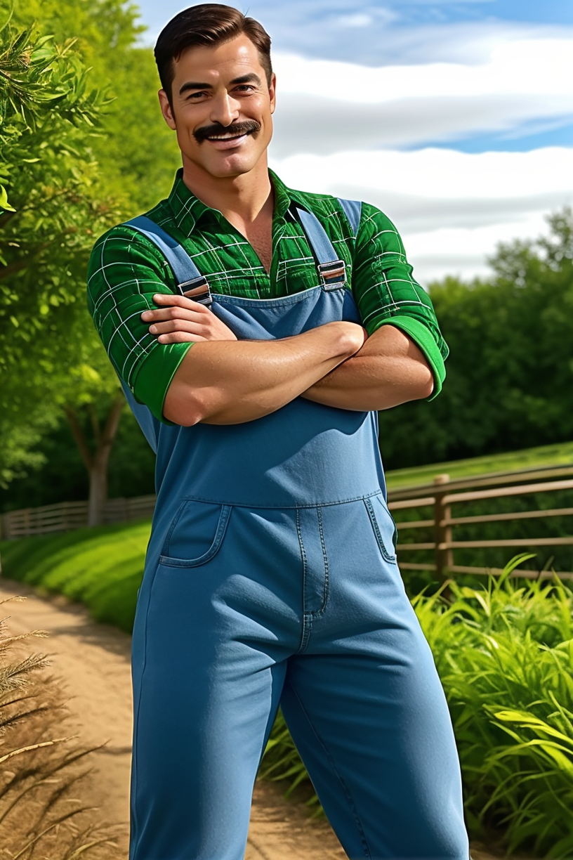 Clothing: plaid shirt, green shirt, overalls