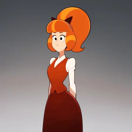 1girl, solo, Signorina Betty, black eyes, ponytail, red hair bow, orange hair, red vest, white shirt, long sleeves, long skirt,