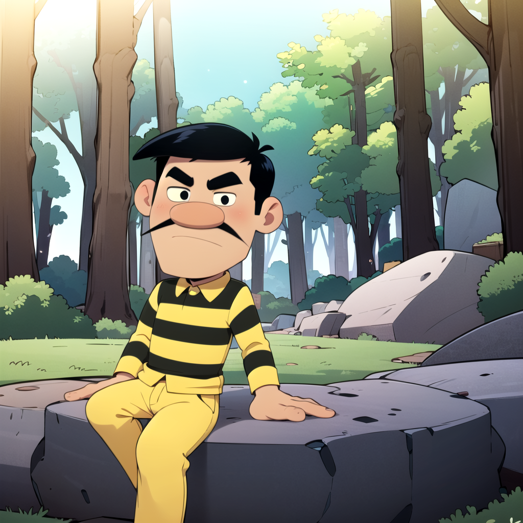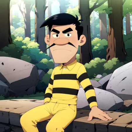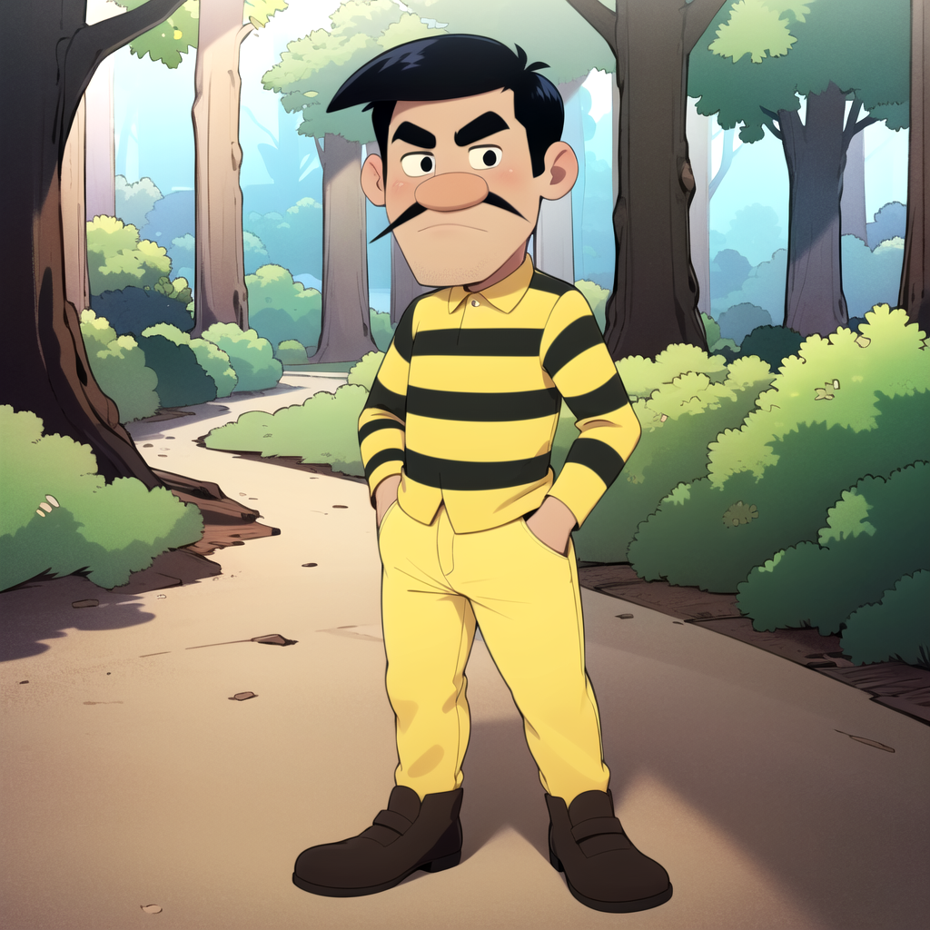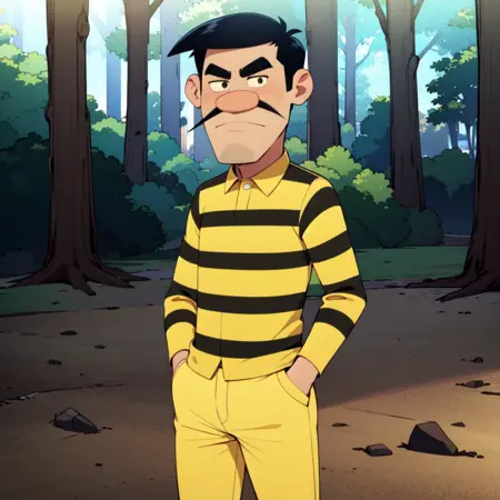 Joe Dalton, solo, 1boy, black hair, black eyes, facial hair, mustache, thick eyebrows, yellow striped shirt, collared shirt, yellow pants,