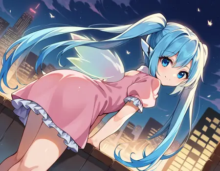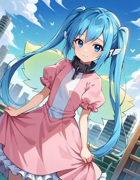 nymph, blue eyes, blue hair, long hair, long twintails, robot ears, twintails, two side up, wings