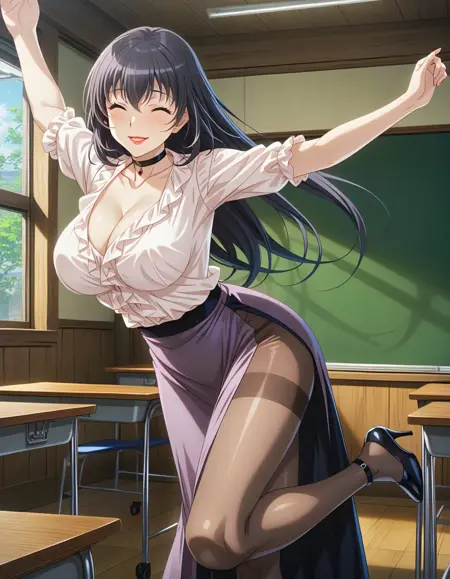 推奨プロンプト(衣装_2):black choker, white blouse, long skirt, skirt, side slit, pantyhose, high heels,