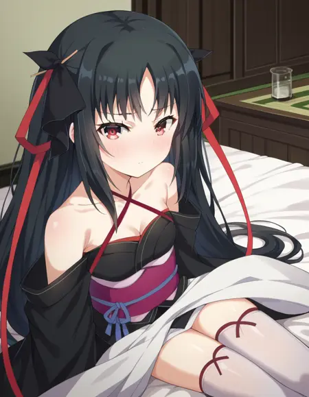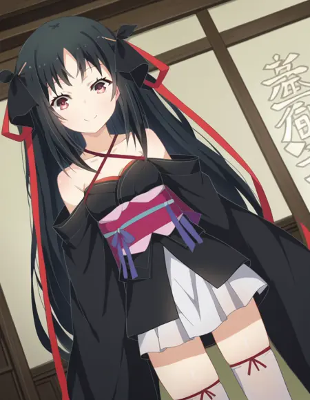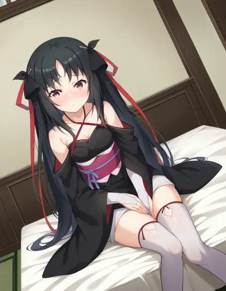 허벅지까지 올라오는 양말, 어깨 노출, 분리된 소매, 일본 복장, 기모노, 띠, 오비,