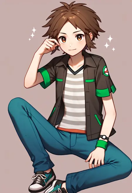 学生服装:nate_st,棕色头发,棕色眼睛,敞开式短袖,蓝色长裤,条纹衬衫,绿色腕带,运动鞋