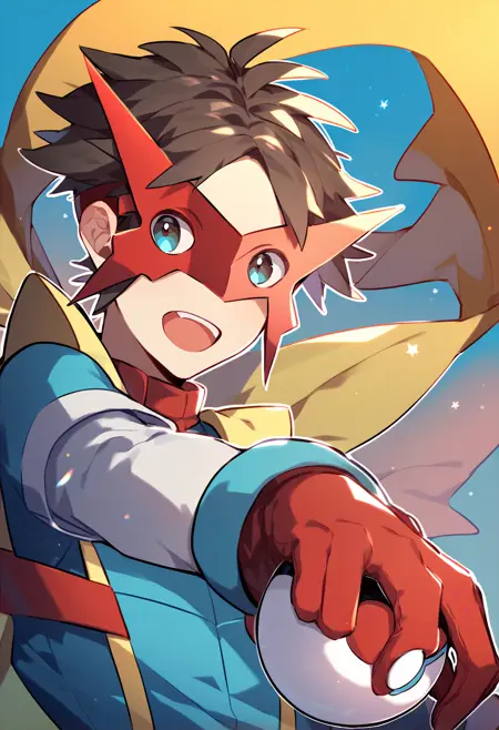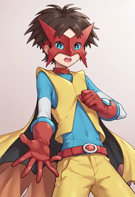 Riolu Kid outfit: nate_riolu, brown hair, brown eyes, red gloves, red mask, yellow cape, red shoes, blue bodysuit, yellow shorts, yellow vest