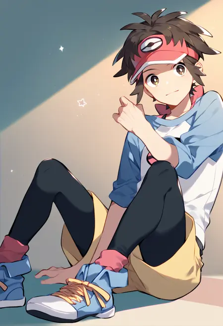 Rosa outfit: nate_rosa, 1boy, brown eyes, brown hair, visor cap, black pantyhose , sneakers, yellow shorts, raglan sleeves