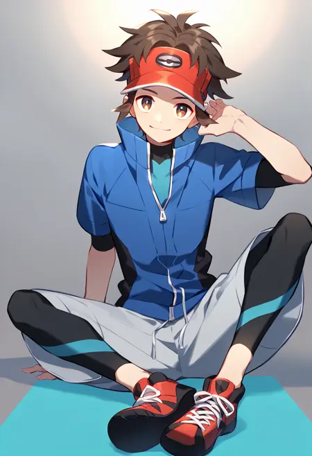默认服装:nate,棕色眼睛,棕色头发,衣物下穿连体衣,多色连体衣,灰色短裤,红色遮阳帽,运动鞋,短袖,拉链拉片,蓝色夹克