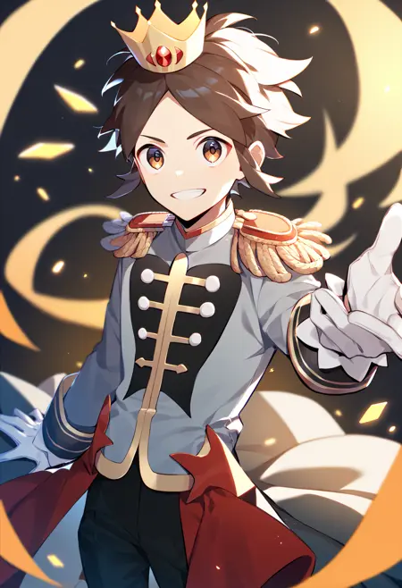 Neo冠军服装:nate_neo_champion,棕色头发,棕色眼睛,金色小王冠,白色手套,肩章,灰色夹克,红色腰披,黑色长裤