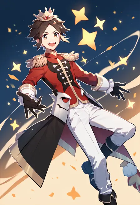 Ex Color: nate_neo_champion, brown hair, brown eyes, silver mini crown, red waist cape, black gloves, gray epaulettes, red jacket, boots, white pants