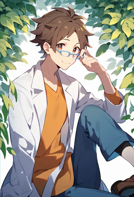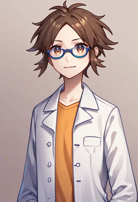Scientist outfit: nate_sc, brown eyes, brown hair, brown footwear, open lab coat, orange shirt, blue pants