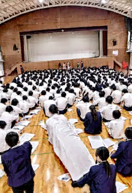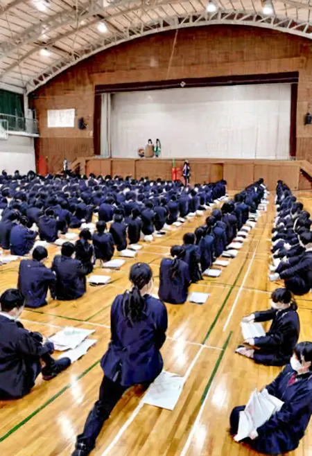 - 체육관에서의 모임 풍경 / 体育館での集会風景 (일본의 학교에서는 학생들을 운동장이나 체육관에 줄지어 세우고 이야기하는 집회를 자주 열습니다.)