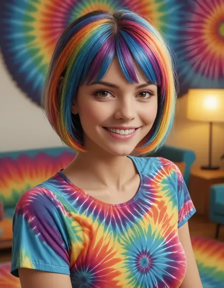 添加辅助词 rainbow 会有所帮助,例如 "rainbow hair" 或 "with eptiedyeworld pattern on everything"。