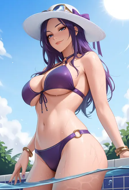 Add "holding water gun" if you want her water gun, however it doesn't come out great.
