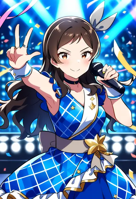 kitazawa shiho, lumiere papillon, brown hair, black hair, brown eyes, yellow eyes, swept bangs, parted bangs, eyebrows visible through hair, long hair, wavy hair, hair down, blue jacket, polka dot jacket, sleeveless jacket, white shirt, layered sleeves, yellow sleeves, white sleeves, short sleeves, pleated skirt, white skirt, wrist cuffs, wristband, epaulettes, gold trim, feather hair ornament, wing hair ornament, white feathers, butterfly necklace, bracelet, ascot, white neckerchief, white neckwearMillion dreams / ミリオンドリームス