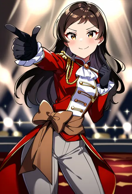 kitazawa shiho, etoile brillant, brown hair, black hair, brown eyes, yellow eyes, swept bangs, parted bangs, eyebrows visible through hair, long hair, wavy hair, hair down, military uniform, red jacket, open jacket, double-breasted, tailcoat, long sleeves, frilled sleeves, white shirt, white pants, epaulettes, aiguillette, sash, white ascot, white neckwear, brooch, black gloves, jewelry, buttons, gold trim, fringe trim, frills,brown bow, back bow, knee boots, high heel boots