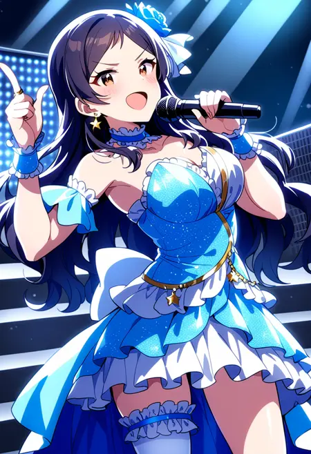 kitazawa shiho, crescendo glitter, brown hair, black hair, brown eyes, yellow eyes, swept bangs, parted bangs, eyebrows visible through hair, long hair, wavy hair, hair down, frilled dress, blue dress, strapless dress, layered dress, sleeveless dress, detached sleeves, blue skirt, frilled choker, blue choker, detached collar, hair flower, blue rose, wristband, star earrings, jewelry, star \(symbol\), hair bow, blue bow, blue ribbon, wrist cuffs, bare shoulders, collarbone, thighhighs, white legwear