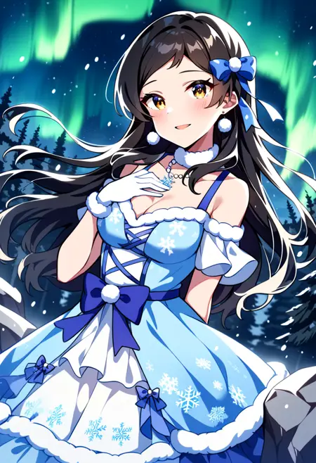 kitazawa shiho, bright aurorajewel, brown hair, black hair, brown eyes, yellow eyes, swept bangs, parted bangs, eyebrows visible through hair, long hair, wavy hair, hair down, fur-trimmed dress, blue dress, white dress, layered dress, sleeveless dress, cross-laced clothes, short sleeves, detached sleeves, snowflake print, fur-trimmed gloves, white gloves, hair ribbon, hair bow, blue bow, hair ornament, purple bow, blue ribbon, fur collar, pendant, jewelry, pom pom \(clothes\), fur trim, frills, blue legwear, blue footwear, high heel boots, knee boots, lace-up boots, bare shoulders, collarbone, cleavageCrescendo blue (Outfit name: Crescendo glitter) / クレシェンドブルー (衣装名:クレシェンドグリッター)