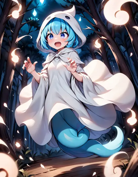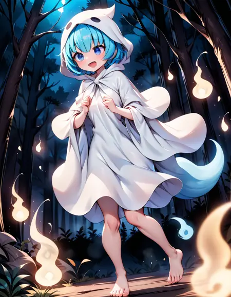 Keywords are : "yu_puyopuyo, blue hairs, short hairs, ghost costume, ghost tail"