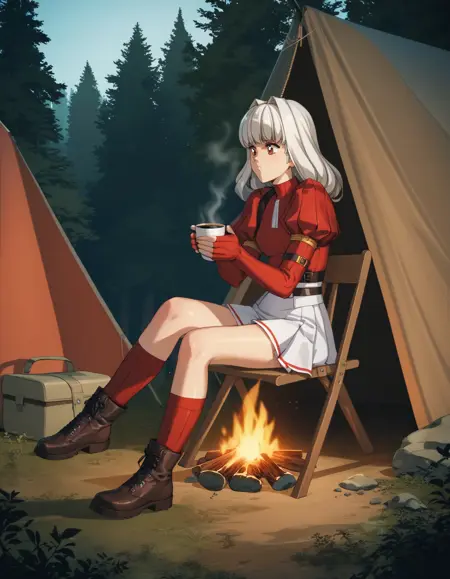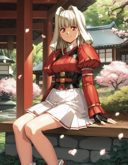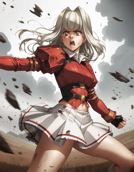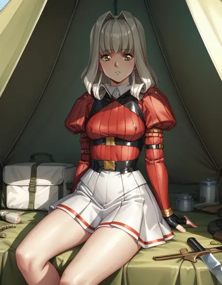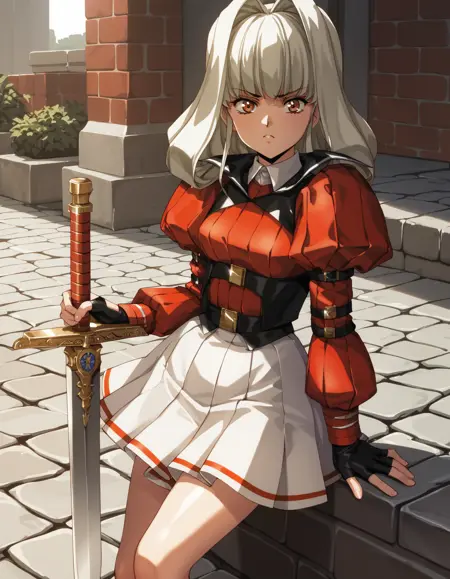 charlone claudius, juliet sleeves, red shirt, chest harness, miniskirt, fingerless gloves, thigh strap, white footwear