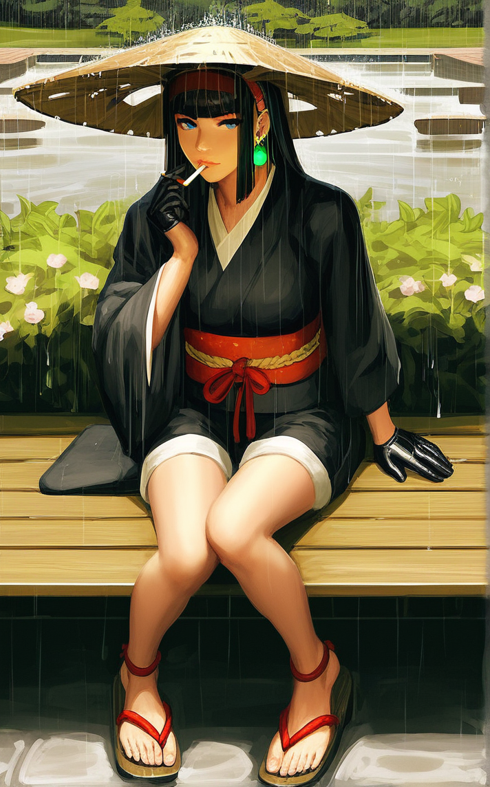 STYLE_PONYXL_guweiz_ownwaifu, anime girl in a kimono outfit sitting on a bench in the rain, 1girl, full body, looking at viewer, blue eyes, black hair, long sleeves, black gloves, straw hat, ajirogasa, closed mouth, jewelry, outdoors, earrings, hairband, shorts, japanese clothes, blunt bangs, armor, lips, jingle bell, sandals, holding cigarette, smoking, hand on headwear, rice hat