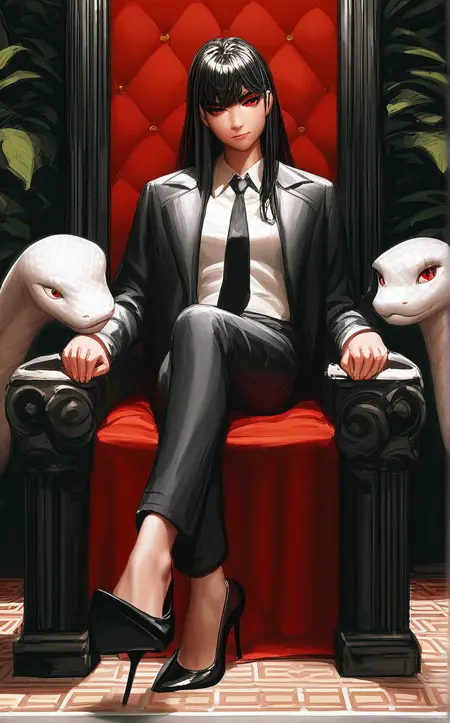 STYLE_PONYXL_guweiz_ownwaifu, anime girl sitting on a bench in a red and black scene, 1girl, long hair, looking at viewer, white shirt, black hair, long sleeves, red eyes, closed mouth, black jacket, full body, black necktie, collared shirt, black pants, black footwear, high heels, animal, formal, crossed legs, suit, jacket on shoulders, white snake, throne
