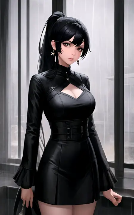 STYLE_PONYXL_guweiz_ownwaifu, arafed woman in a black dress posing for a picture, 1girl, long hair, medium breasts, looking at viewer, black hair, black gloves, necklace, closed mouth, cleavage, jewelry, bare shoulders, standing, collarbone, full body, holding weapon, sleeveless dress, holding sword, black footwear, black eyes, arm up, high heels, bracelet, thigh strap, chest tattoo, blood splatter, side slit, long dress, blood on weapon, holding mop, blood on leg