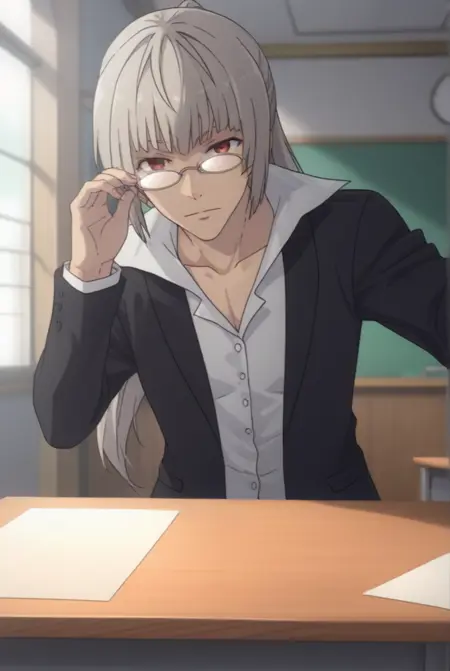 默认服装:["红眼睛,灰发,长发,眼镜,马尾辫,白衬衫,西装,正式"]