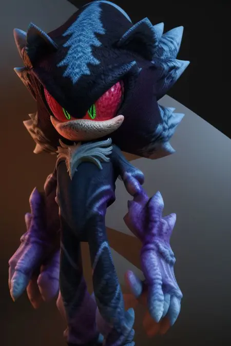 프롬프트: Mephiles The Dark, 어두운 파란색 피부, 밝은 파란색 가시, 붉은 분홍색 공막, 라임 그린 홍채, 발톱, 회색 발톱, 보라색 안개