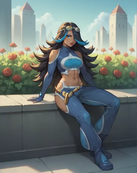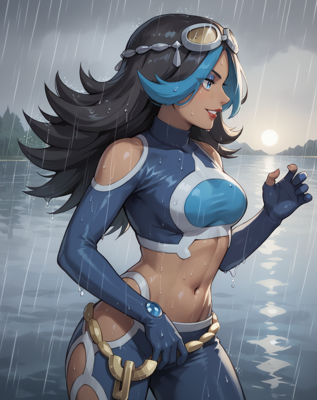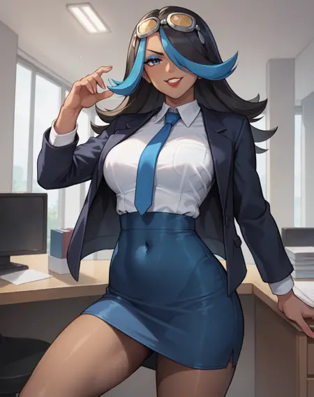 Character: 1girl, shelly \(pokemon\), long hair, black hair, blue eyes, dark skin, hair over one eye, lipstick, makeup, multicolored hair, blue hair, goggles, goggles on head, streaked hair, breasts