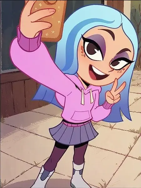 服装:粉色连帽衫、裙子、紧身裤、白色靴子