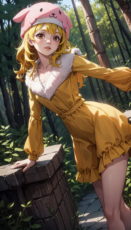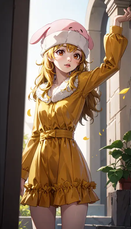 long hair, blonde hair, brown eyes, yellow dress, fur trim, long sleeves, pink hat