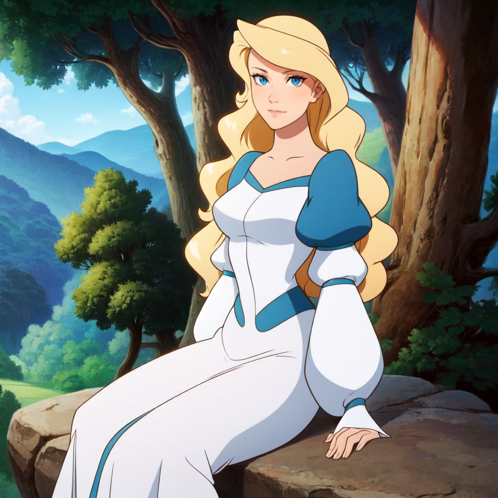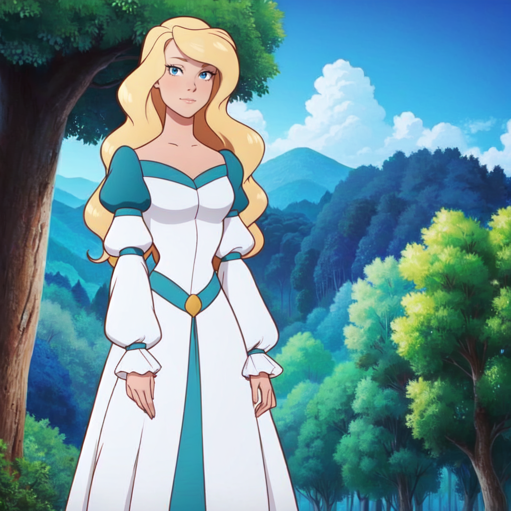 1girl, solo, Odette, long hair, blonde hair, blue eyes, white dress, long sleeves, puffy sleeves, juliet sleeves,