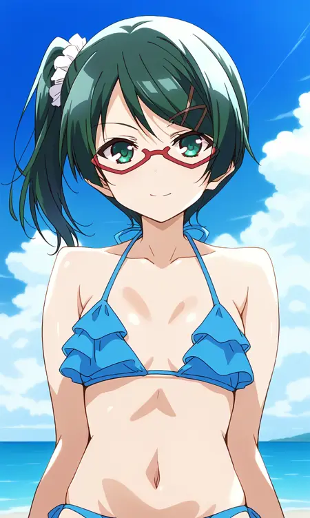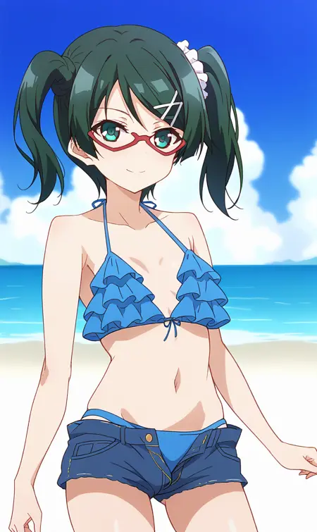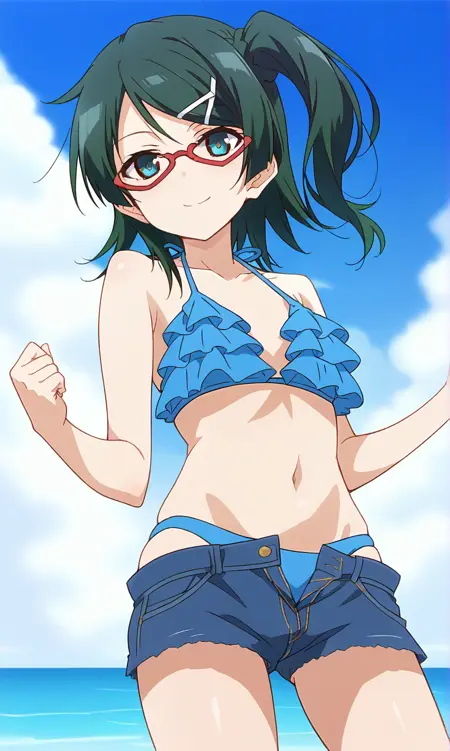 侧马尾,泳装,比基尼,荷叶边,短裤,发夹,超短裤,牛仔布,蓝色比基尼,荷叶边比基尼,蓝色短裤,牛仔短裤,未扣扣,敞开裤门,敞开短裤