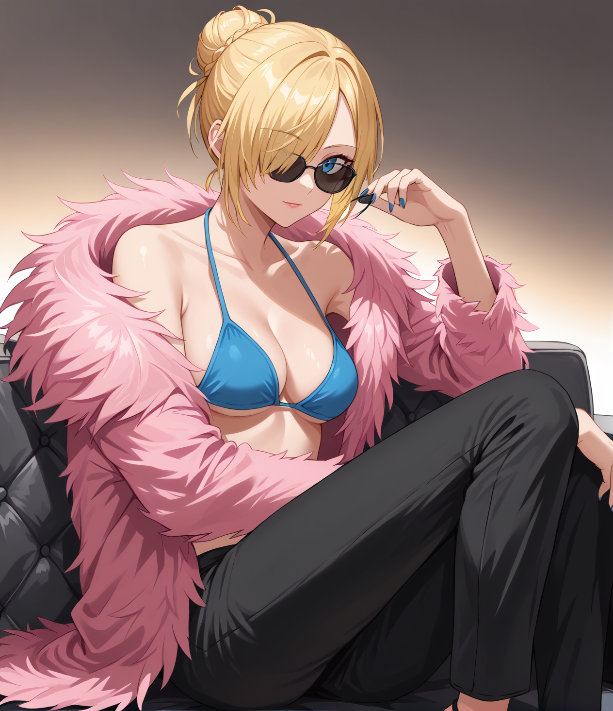 キーワード: TheBodyguard、ブロンド、サングラス、青いビキニトップ、結び髪、片方の目に髪がかかる、ピンクのファーのフェザーボア、黒いズボン