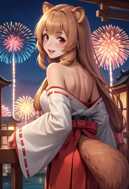 刀の英雄: raphtaliahero, 動物の耳, 神輿, 日本の衣装, 白い着物, 広い袖, リボン縁取りの袖, 赤い袴, 袴スカート, アライグマの尾