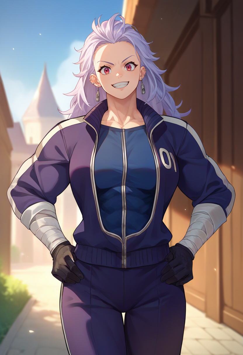 服装 #1: 紫色夹克, 运动夹克, 黑色手套, 紫色长裤, 耳环