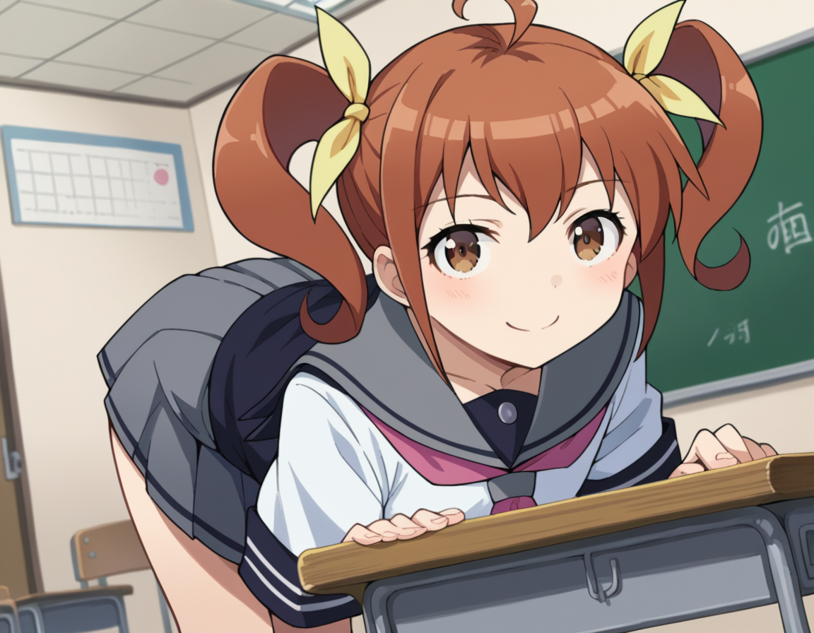 kanao kurusu, brown hair, ribbon, twintails, brown eyes, hair ribbon, ahoge,